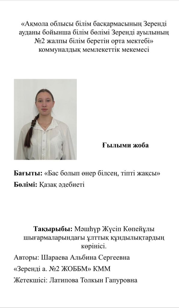 Жалпы орта білім беретін мектеп оқушылары арасында өткен республикалық «Мәшһүр-Жүсіп оқулары» байқауында мектебіміздің 10-сынып оқушысы Шараева Альбина жүлделі III орынға ие болды!